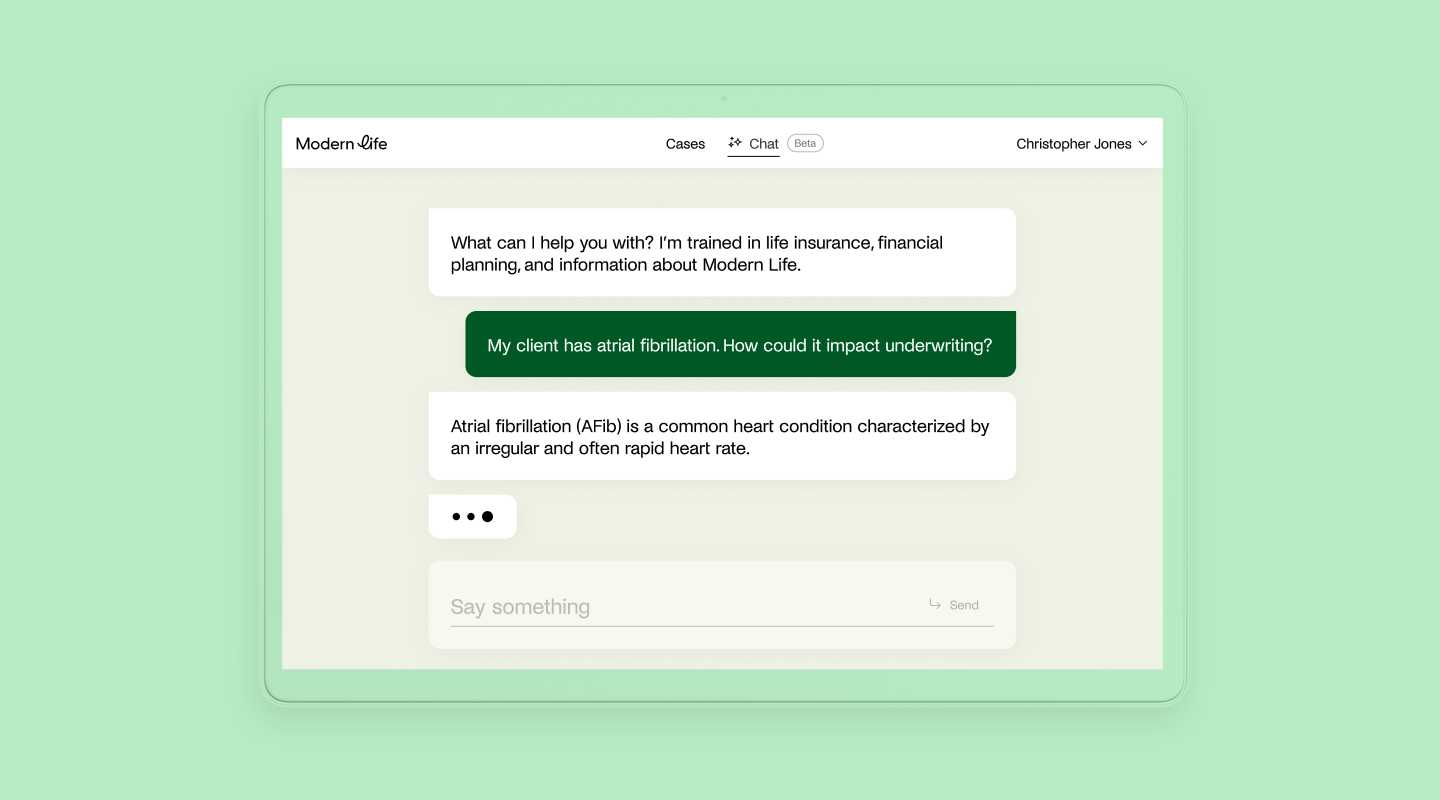 Modern Life's technology supports advisors across every stage of the life insurance purchase journey, from advice, to application, to in-force management. The platform includes digital field underwriting leveraging data analytics to determine highest value products for customers and unique, shareable digital intake forms to remove frictions in the collection of client data. The platform also optimizes for accelerated underwriting, reducing the time from quote to policy approval.
